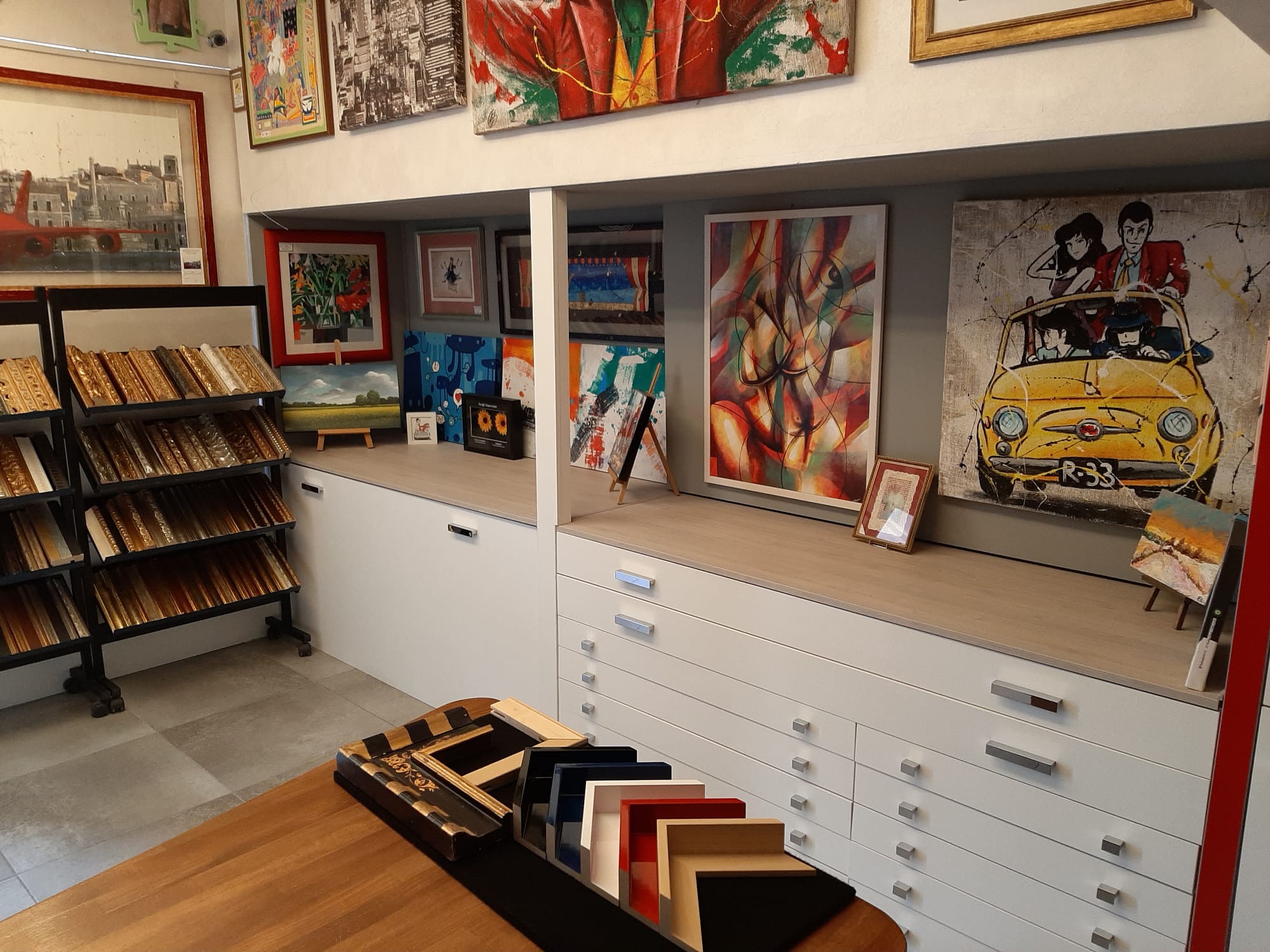 vanta un vasto repertorio di serigrafie dipinti,incisioni,stampe antiche e poster valorizzati con originali pas-partout in legno carte colorate e cornici di varie forme e colori